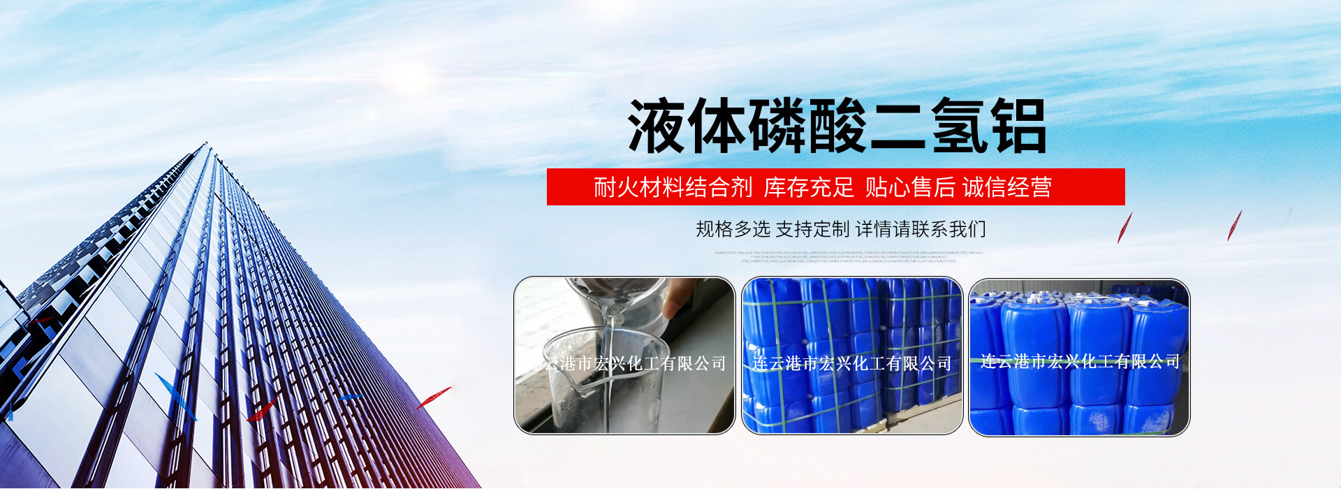 連云港市宏興化工有限公司成立于2008年,十余年來致力于化工產(chǎn)品技術(shù)開發(fā),為客戶量身打造適合的產(chǎn)品,公司磷酸二氫鋁產(chǎn)品采用高純原料生產(chǎn),無色透明,無任何雜質(zhì),質(zhì)量持久穩(wěn)定,公司與江蘇、河南、山東等眾多耐火、涂料等企業(yè)保持長期合作關(guān)系,誠信經(jīng)營、物優(yōu)價廉是我們的服務(wù)宗旨,宏興化工期待與您合作??!